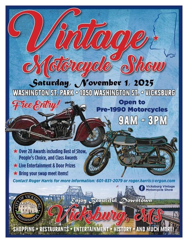 Ride up to beautiful downtown Vicksburg, Mississippi for the annual Vintage Motorcycle Show, celebrating the best of classic two-wheeled history. The show is open to all pre-1990 motorcycles and offers free entry for participants and spectators alike.